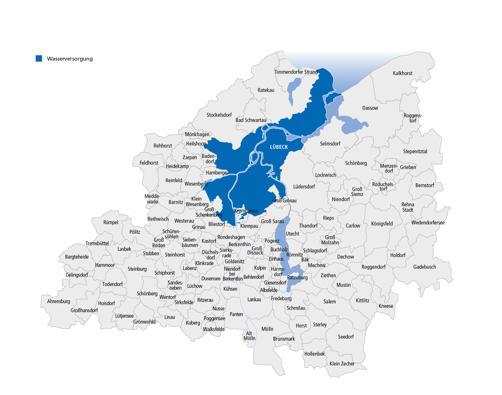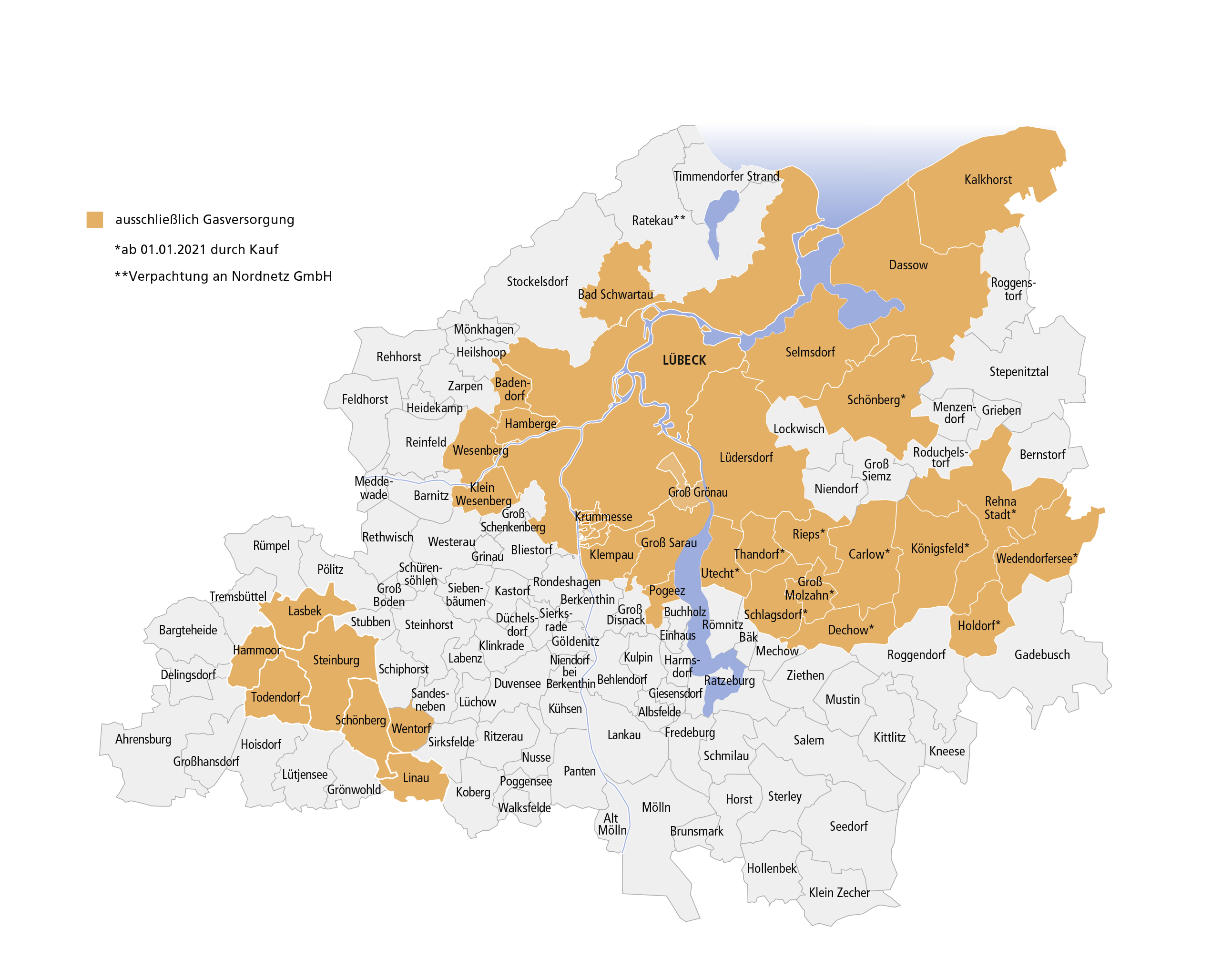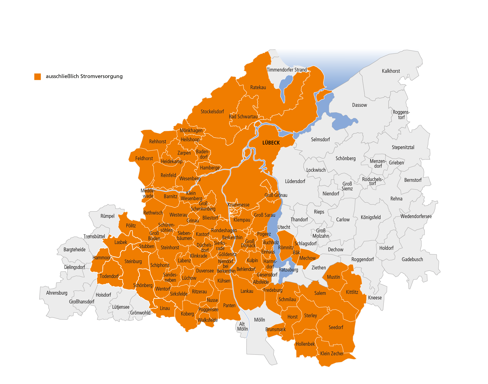 Unser Netzgebiet erstreckt sich dabei mit einer Länge von insgesamt 6780 km Rohr/Kabelnetz über das Gebiet der Hansestadt Lübeck und das angrenzende Lübecker Umland.